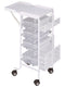 On the sides, large and small mesh racks provide additional storage for coloring agents, brushes, rollers, bottles, mirrors, client cards, or magazines.
